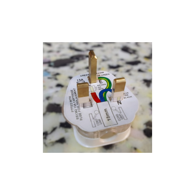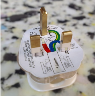 A standard UK 3-pin fused plug with a built-in 13A fuse, designed for safe and reliable connection of household electrical appliances. Features clearly marked live, neutral, and earth terminals and complies with UK safety standards.