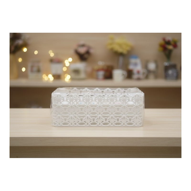 Elegant white plastic storage rack with a lace-style cutout design. Lightweight yet sturdy, ideal for organizing cosmetics, toiletries, kitchen items, or small household accessories. Its stylish look makes it suitable for countertops, shelves, or cabinets while keeping items neatly arranged and easily accessible.